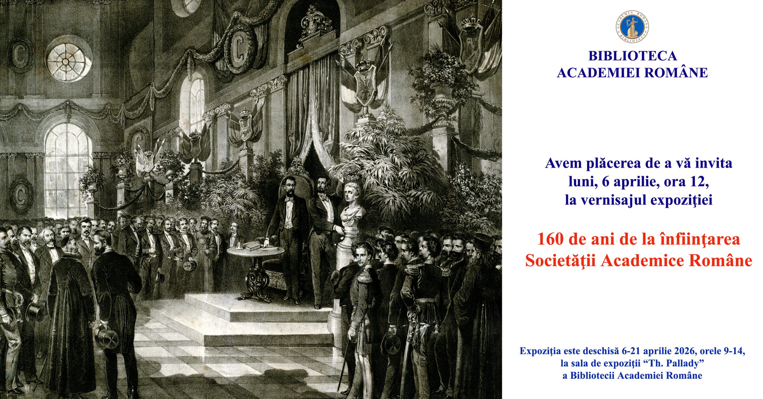 Biblioteca Academiei Române vernisează luni, 6 aprilie 2026, expoziția 160 de ani de la înfiinţarea Socieţăţii Academice Române. Vernisajul va avea loc în Sala „Theodor Pallady” din Calea Victoriei nr. 125, începând cu ora 12, și este onorat de prezența acad. Ioan-Aurel Pop, preşedintele Academiei Române, care va rosti cuvântul de deschidere. Despre omagiul expozițional adus la 160 de ani de la înfiinţarea Societăţii Academice Române va vorbi prof. ing. Nicolae Noica, directorul general al Bibliotecii Academiei Române.